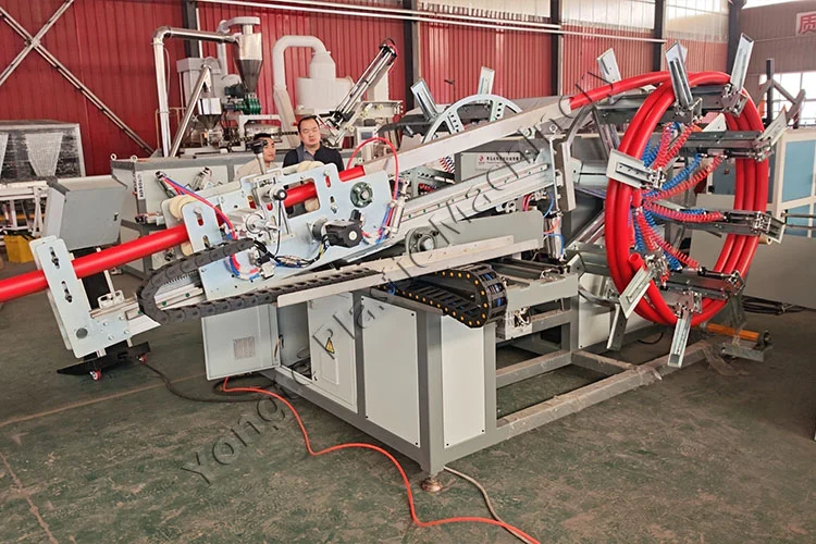 През 2025 г. успешно доставихме два персонализирани комплекта автоматични машини за навиване на PE тръби на водещо аржентинско предприятие за преработка на пластмаса. Клиентът изискваше високоефективни решения за навиване, които да отговарят на техните новоразширени високоскоростни линии за екструдиране на PE тръби. Поръчката се състои от две специализирани единици: една двустанционна автоматична машина за навиване, оптимизирана за тръби с диаметър 15-32 mm, и друг модел с голям капацитет, предназначен за диаметри 20-63 mm. Тези машини се интегрират безпроблемно с високоскоростни линии за екструдиране на PE тръби за автоматично навиване на тръби в еднакви ролки. Оборудван със система за автоматично отчитане на дължината, машината задейства автоматично рязане и прехвърляне на станцията, след като целевата дължина бъде достигната. Той едновременно осигурява готовата ролка и активира аларма за опаковане, осигурявайки напълно автоматизирано решение за навиване. Строгото фабрично тестване преди изпращането гарантира стабилна работа на място след доставката.