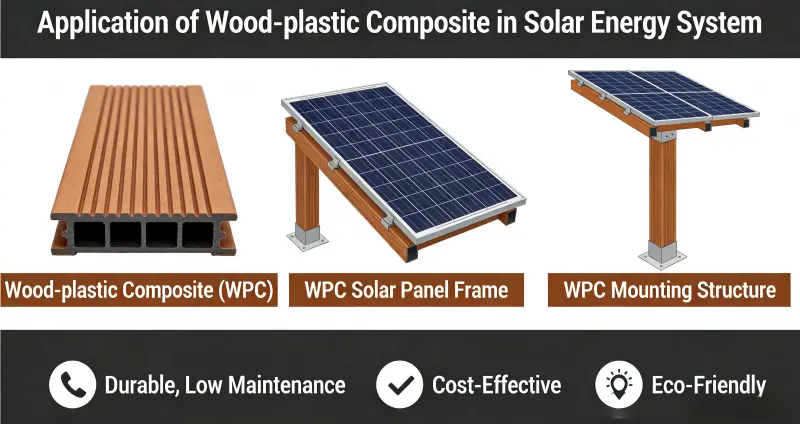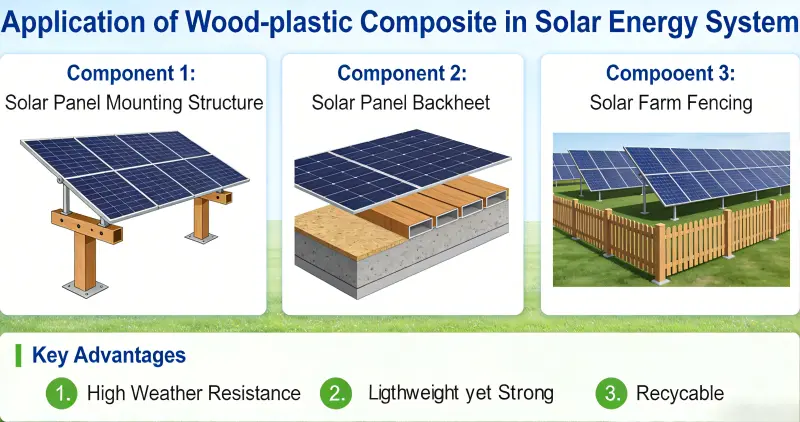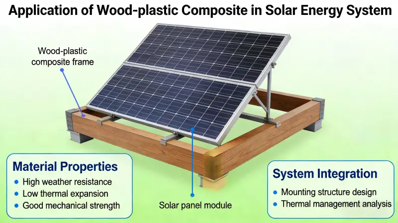 Дървесно-пластмасовият композит (WPC) се очертава като ключов материал в системите за слънчева енергия, включително фотоволтаични (PV) стойки, плаващи електроцентрали, интегриране на фотоволтаични сгради и съхранение на концентрирана слънчева енергия (CSP), поради своите екологични, устойчиви на атмосферни влияния, леки, лесни за поддръжка и лесни за обработка свойства. Той прогресивно заменя традиционните метални и дървени материали.